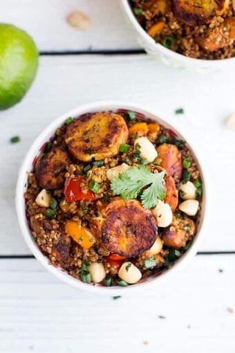Save RecipeMain CourseJanuary 15, 2014Jamaican Jerk Chicken, Fried Plantain and Coconut Fried Quinoa with Macadamia Nuts.