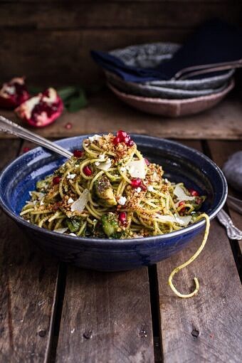 Save RecipeMain CourseNovember 17, 2014Manchego Brussels Sprout + Prosciutto Spaghetti w/Brown Butter Pistachio Pangrattato.