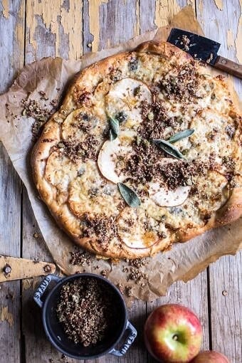 Save RecipeMain CourseSeptember 28, 2015Apple and Caramelized Onion Pizza with Pumpkin Seed Pangrattato.