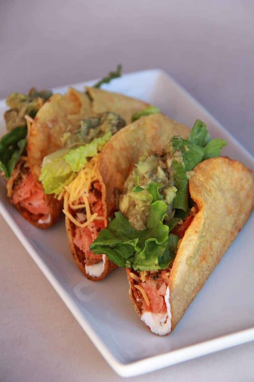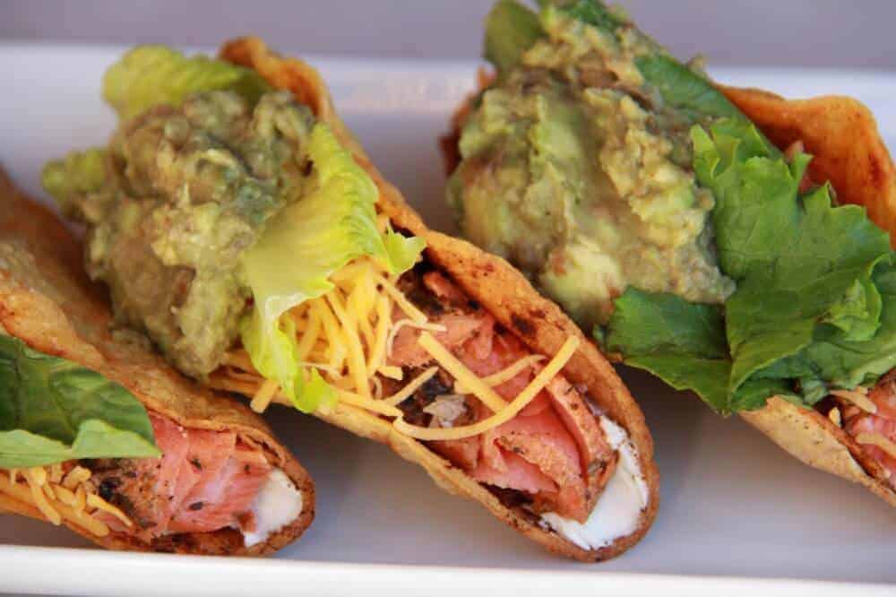 • To assemble smear a good amount (1-2 Oz) of cream cheese on each taco shell. Layer in the salmon and top with about and 1/8 cup of cheddar cheese.