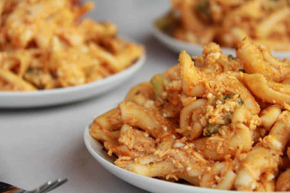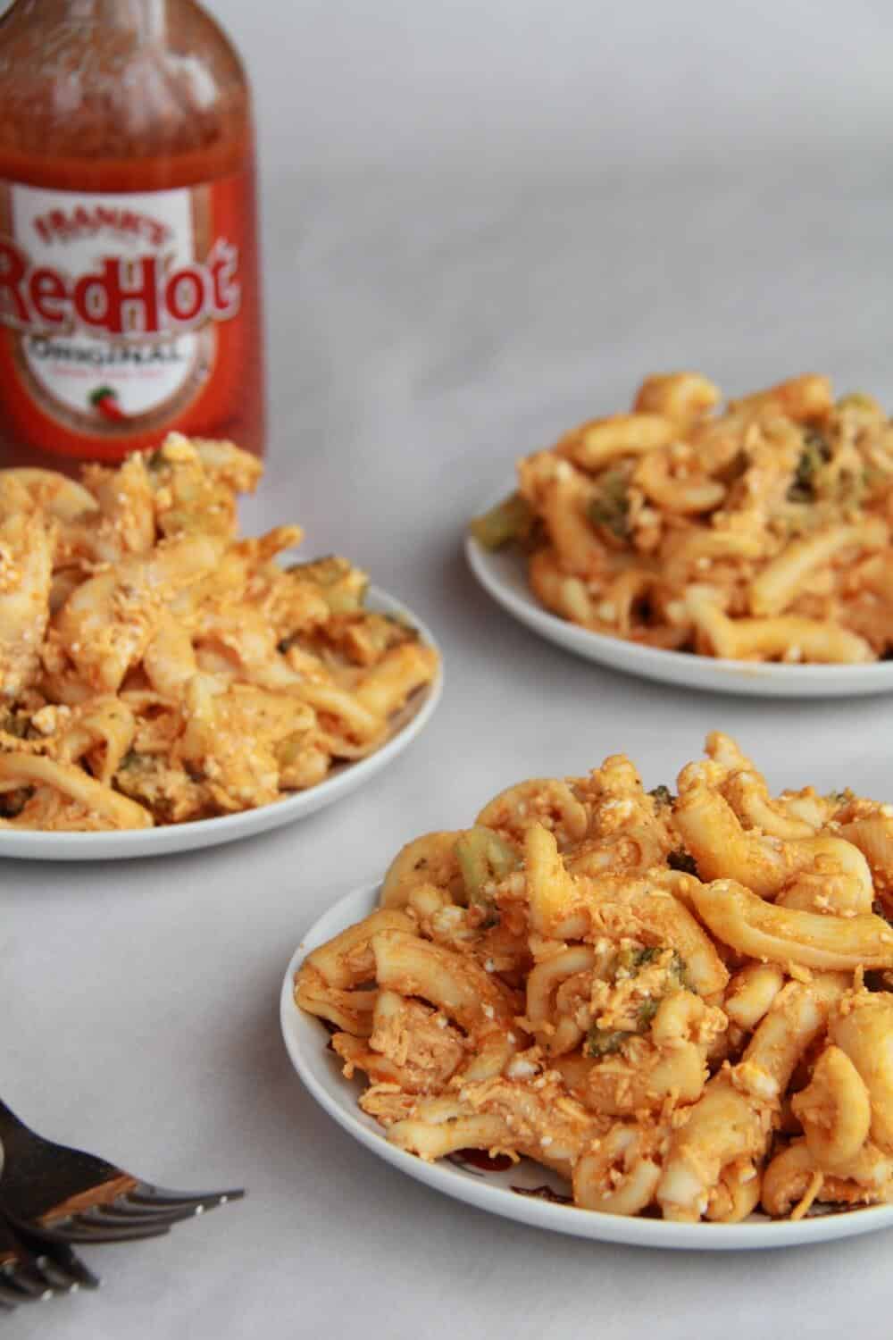 But it tastes good. Really good. Homemade buffalo sauce mixed with cheddar cheese and blue cheese to create a creamy and delicious alfredo-like sauce! One word. Yum.