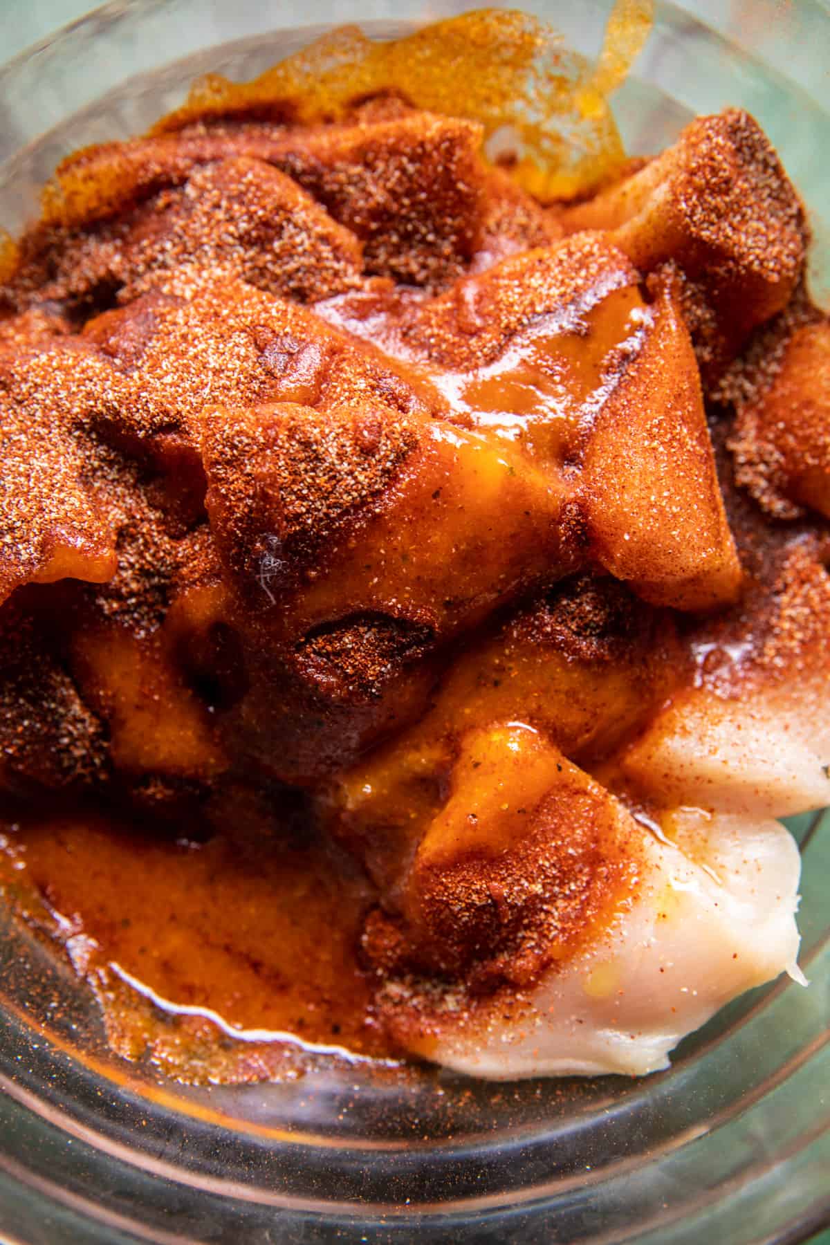 I like to cube the chicken, then season it with seasoned salt and black pepper. Now is when I toss the chicken with a bit of the honey buffalo sauce.