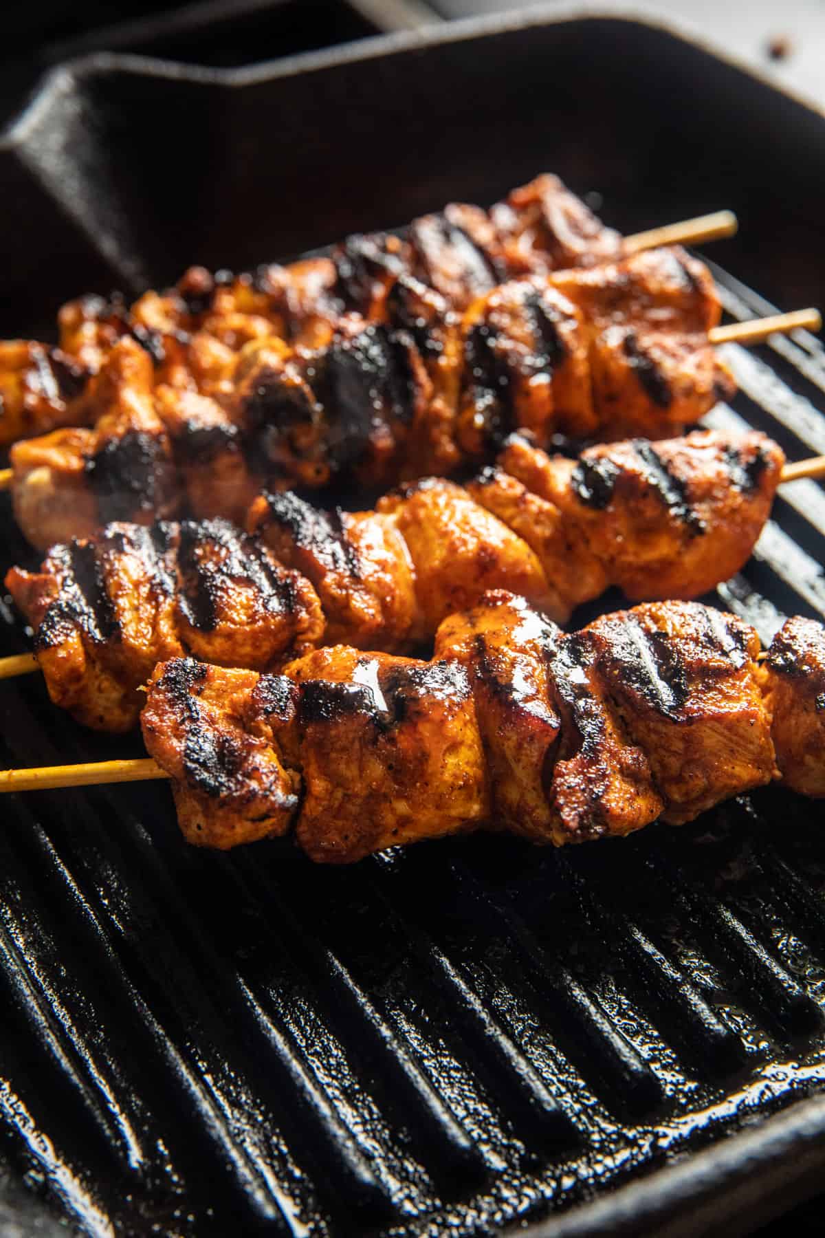 Once the chicken is on the skewers, grill each skewer until golden brown and cooked through.