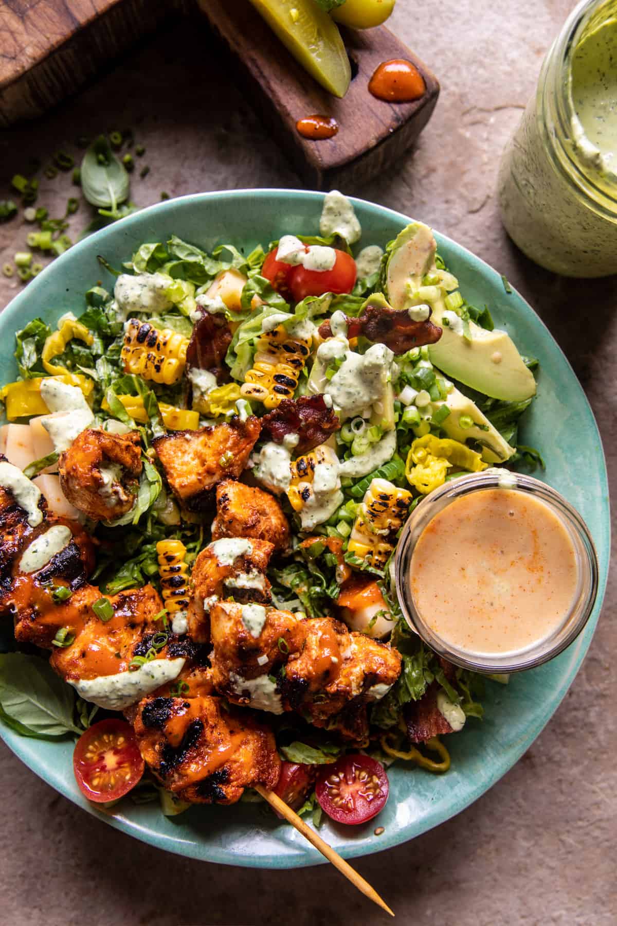 My Chopped Buffalo Chicken Skewer Salad just might become your new summer dinner staple. Spicy, saucy buffalo chicken grilled up on skewers and tossed together with fresh greens, grilled corn, avocado, cheddar cheese cubes, and crispy bacon. Be generous with the creamy jalapeño ranch dressing, it’s extra delicious on top of this spicy-sweet honey buffalo chicken. A perfectly balanced summer dinner salad everyone will love.