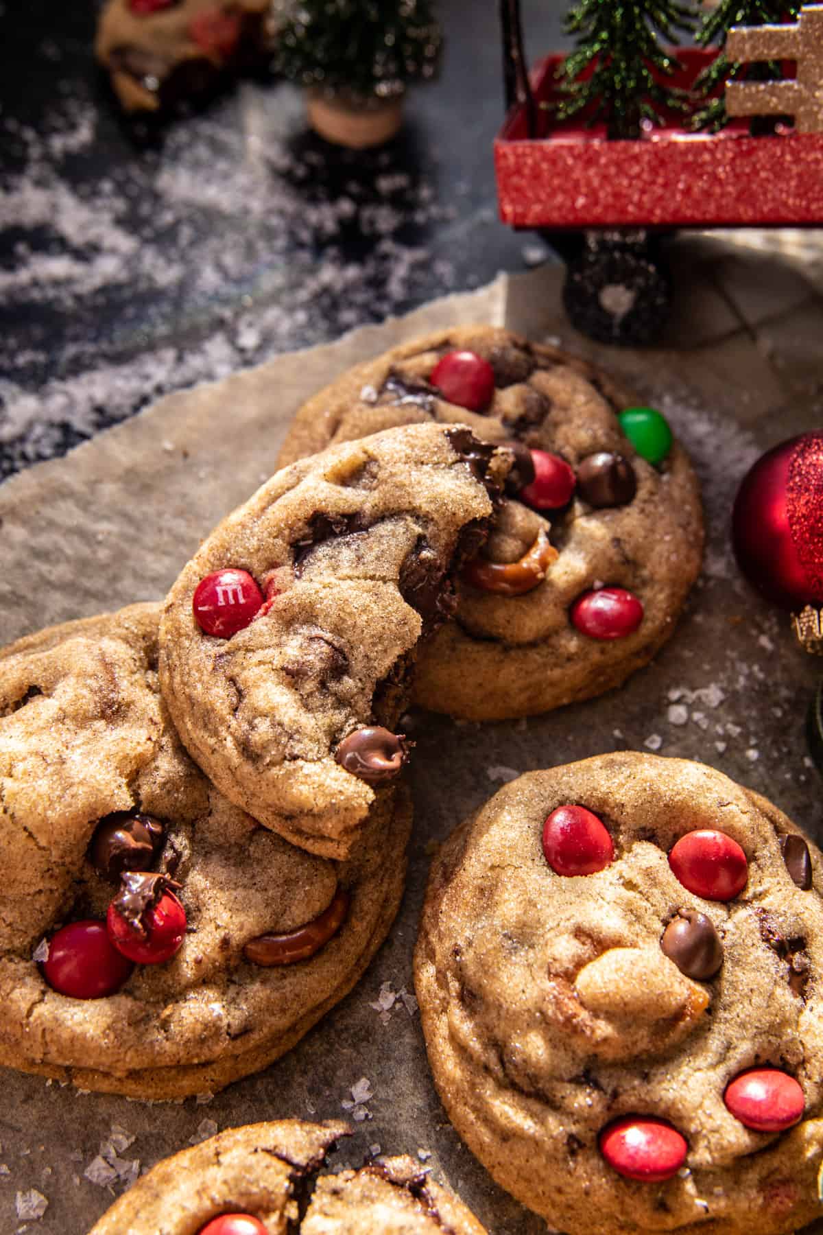 Chewy Christmas Snickerdoodles with pockets of melted chocolate – these cookies are so yummmmy! Made with browned butter, holiday M&Ms, pretzels, chocolate chips, and chunks of dark chocolate. Each cookie dough ball is rolled with cinnamon sugar for that classic Snickerdoodle finish before baking to perfection. There’s nothing not to love about these sweet chocolate Christmas cookies. Each bite is slightly crisp on the edges but soft and gooey in the center, with just a little salty pretzel crunch throughout.