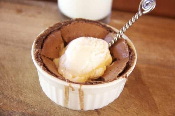 - Bake at 450° F for 10-15 minutes. The center will be quite soft, but the top and sides will be set. Let sit out of the oven for about 5 minutes, then unmold onto a plate or serve in ramekins with a scoop of vanilla ice cream.