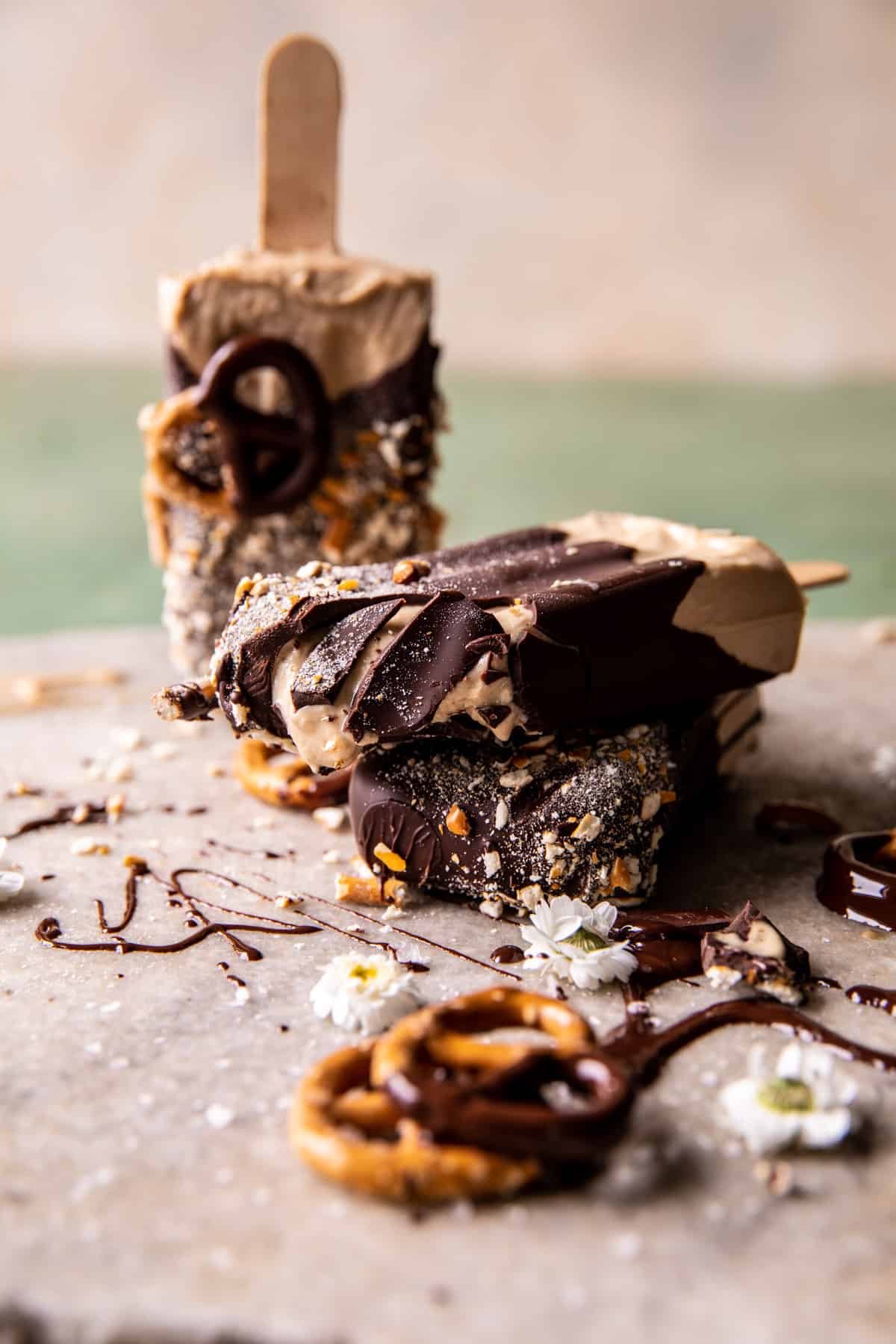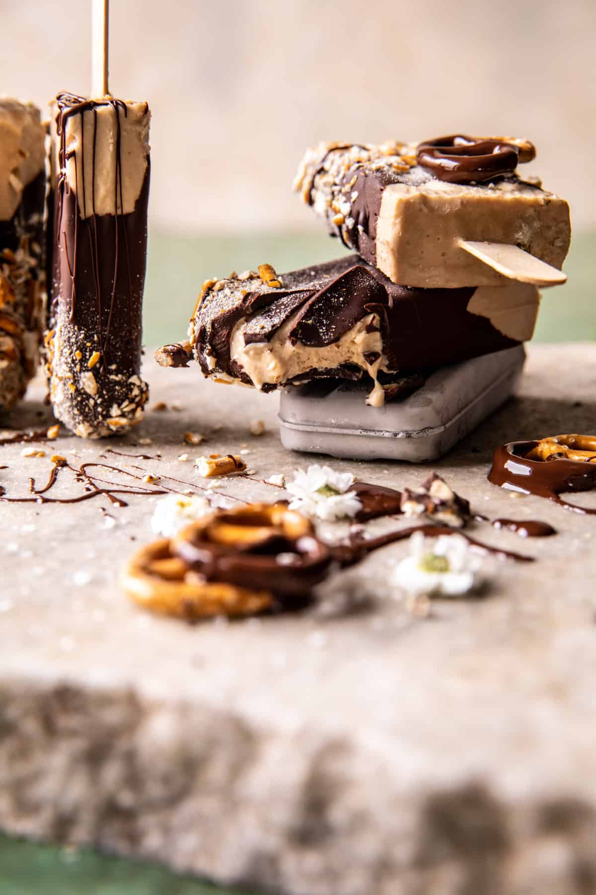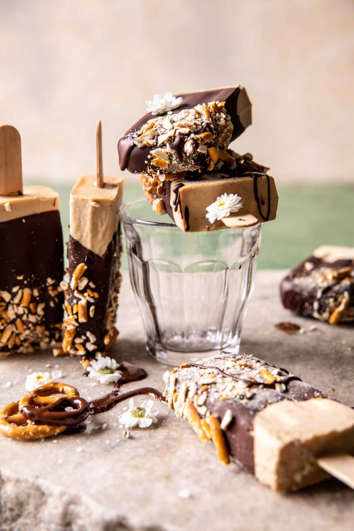 These easy, Homemade Creamy Chocolate Peanut Butter Banana Fudge Popsicles are the frozen treat we all need to have stashed away in our freezers. Made simply with just 4 ingredients: creamy Greek yogurt, bananas, salted peanut butter, and vanilla. Then, a sweet, salty pretzel chocolate shell made with, chocolate, coconut oil, and pretzels! It does not get any simpler. They’re extra creamy, so peanutty, and so very very delicious. These pops are everyone’s favorite, from kids to adults. The perfect snack or dessert to keep stocked in the freezer for a homemade healthier treat!