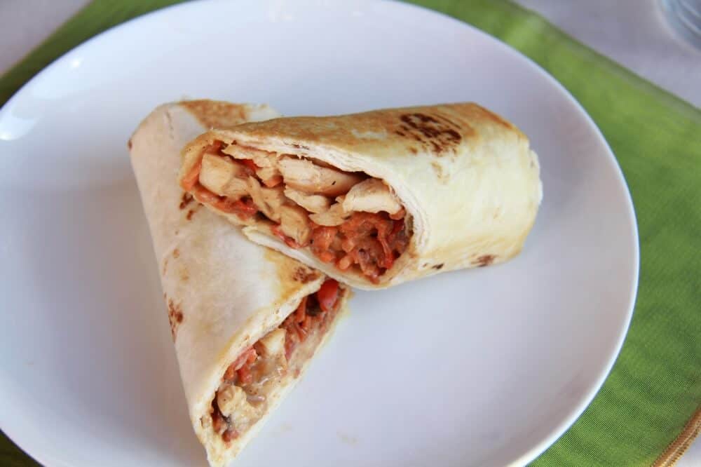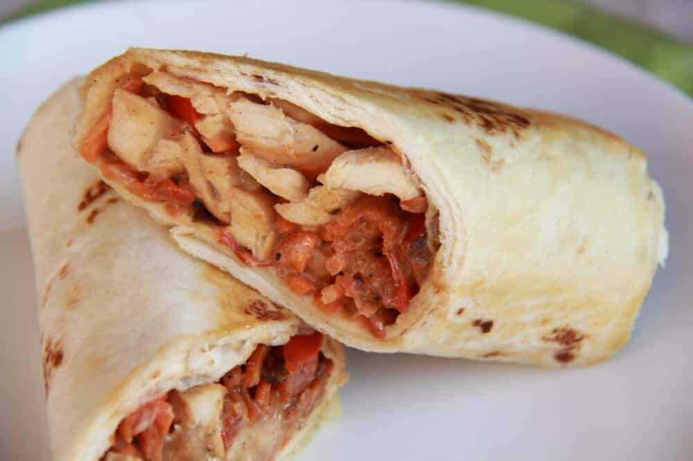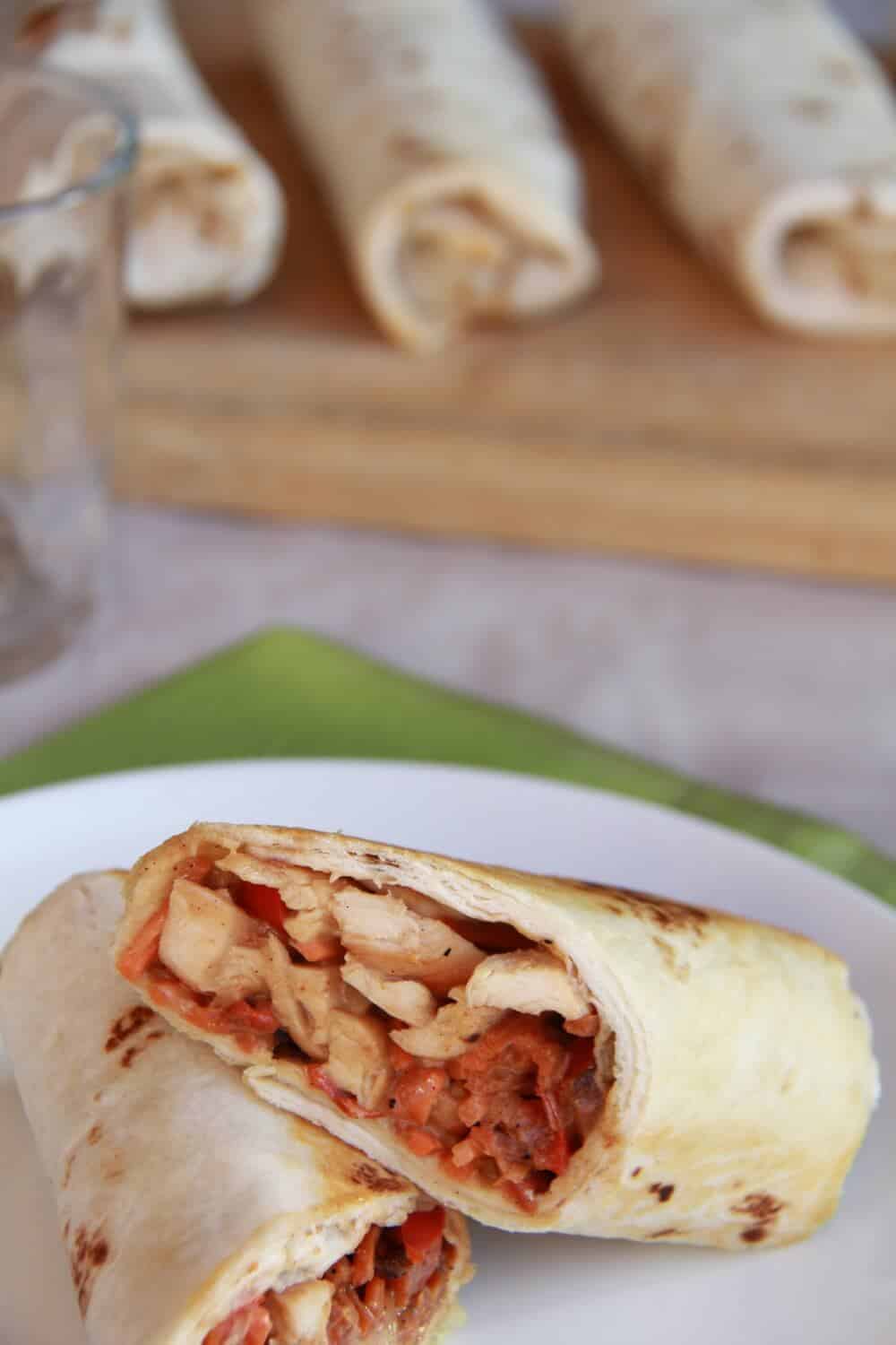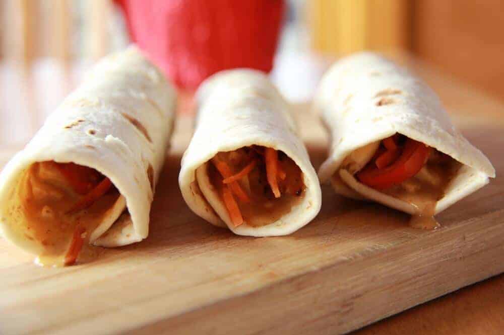 - Working with two tortillas at a time heat them in the microwave for 30 seconds. Add a good amount of the chicken and sauce to the top of one tortilla. Top with some veggies and then tuck in the sides and roll tightly. Repeat with remaining ingredients.