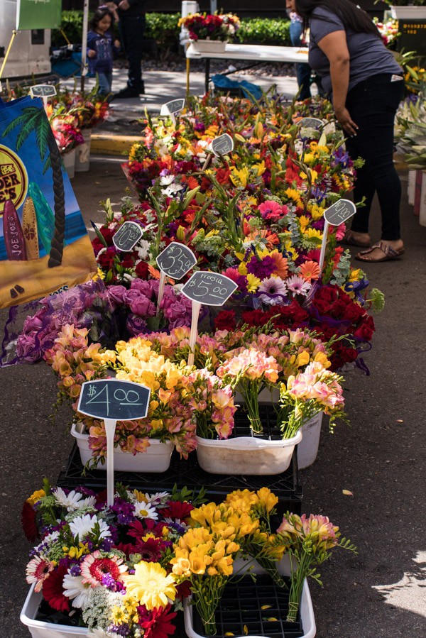 I got up early Saturday morning and went for a โpower walkโ around the bay and then back down the boardwalk. I wanted to get back because I had big plans to hit up the Little Italy Farmers Market in downtown San Diego. Honestly, I think this is what I was most looking forward to about this trip. I LOVE farmers markets and this one did not disappoint. I dragged everyone outta bed and told the boys Iโd buy em breakfast if they came. They pretty much jumped at that. So we all packed in the car and headed downtown. I was basically in flower and produce heaven, and am still dreaming about all the fresh berries. It was amazingโฆI took lots of photos as you can see.