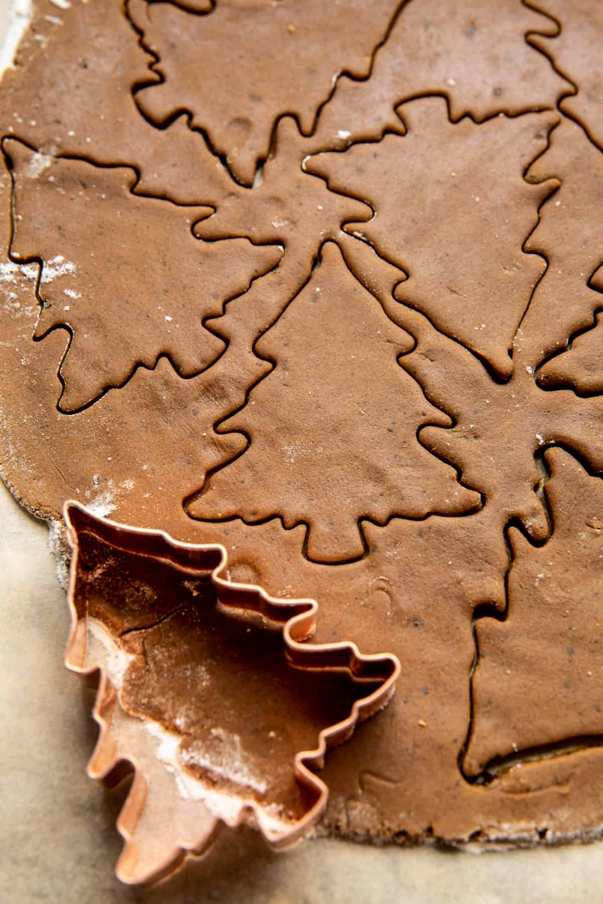 Just as I do with my sugar cookies, I always like to roll out the dough, cut the cookies, and then freeze the cut cookies on a baking sheet for a few minutes. This ensures that the cookies hold their shape. To cut my cookies, I used Christmas tree cutters. But you can use any shapes you have on hand, or that your family loves the most.