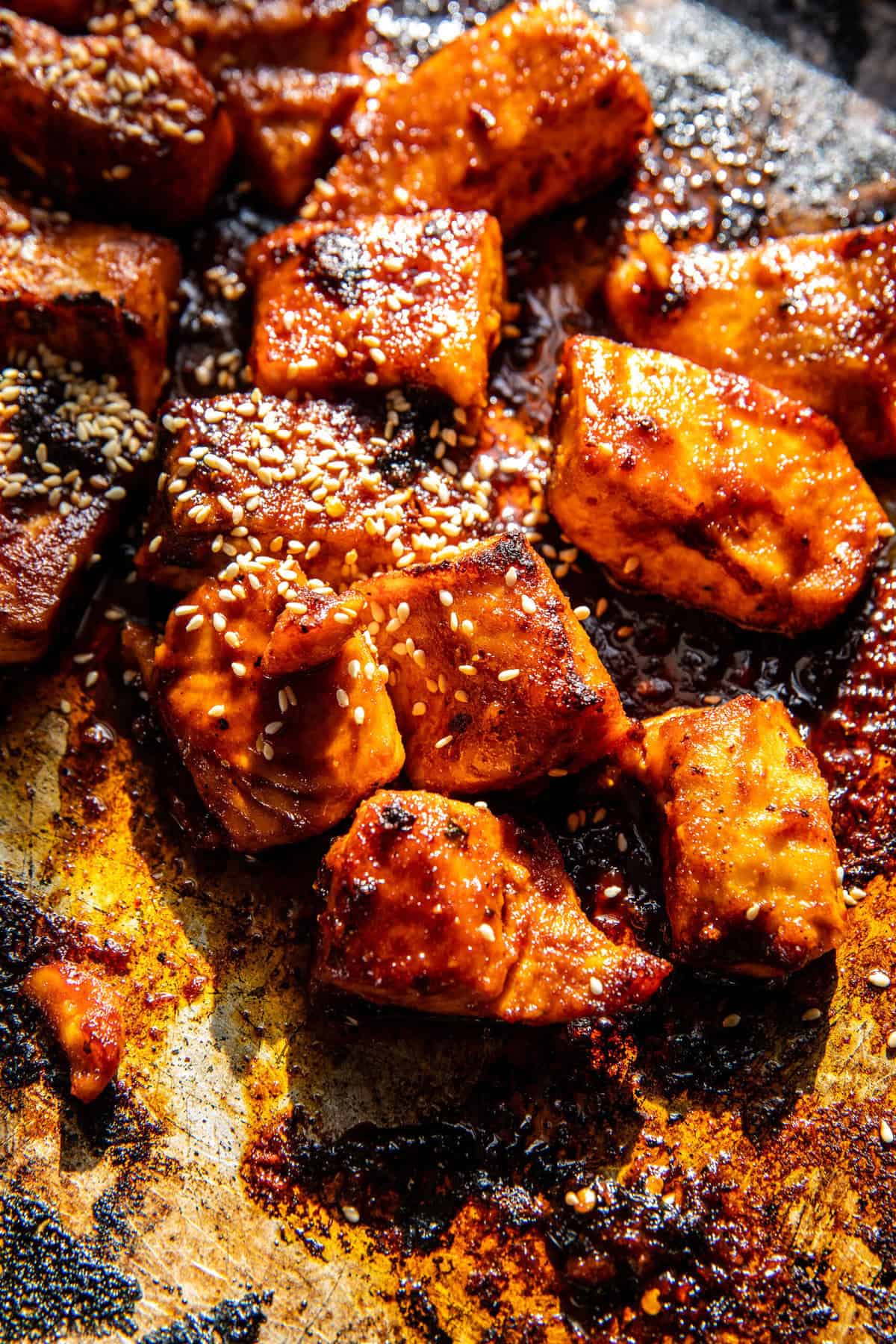 I like to use cubes of salmon fillets. You can choose to leave the skin on or off the salmon, but I find the fish has better flavor when roasted with the skin on. Toss the salmon with ginger, chipotle powder, and chile flakes. I love to use Korean chile flakes.