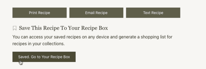 2. After clicking โSave Recipeโ youโll be prompted to select a collection, with โMy First Recipe Collectionโ available as the default. After confirming which collection, youโll see the prompt โSaved. Go to Collections.โ This will take you to your saved recipes, or you can access them anytime by going to the My Recipe Box & Meal Plans page.