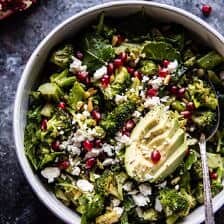 • Pour the dressing over the roasted broccoli. Add the baby kale and pomegranate arils. Gently toss to combine. Transfer the salad to a bowl and top with feta and sliced avocado. Eat!