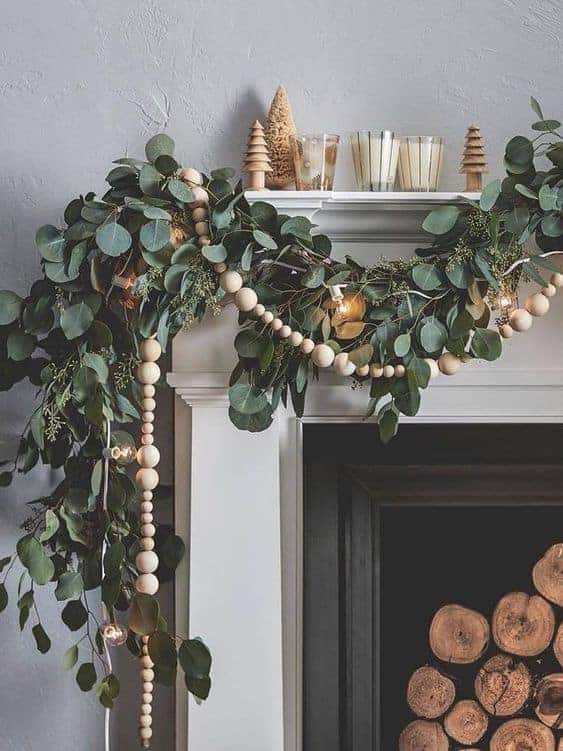 I grab a few bundles of eucalyptus greens for $5 each at the grocery store. I also pick up a bunch of pomegranates. Then I simply arrange the pomegranates around the edges of the greens. I then throw in a few ornaments for an extra festive touchโฆand done. Takes me about 10 minutes and always turns out so pretty. The major bonus in using eucalyptus?