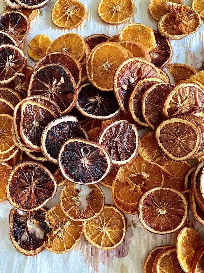 Preheat the oven to 200 degrees. Line a baking sheet with parchment paper. Arrange very thinly sliced orange slices in a single layer, and generously dust with sugar, if desired. Bake until the peels are dry and the flesh is translucent, about 2 1/2 to 3 hours.