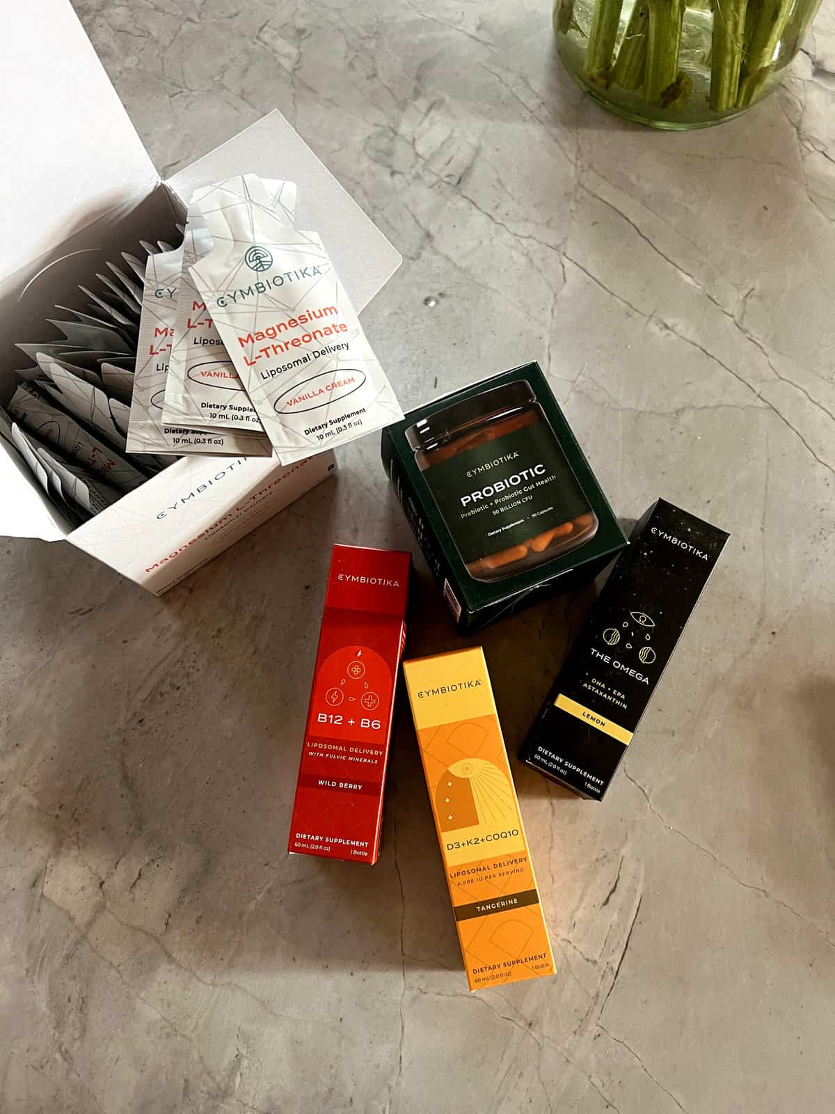 This is my core Cymbiotika line up. I take these while home and traveling โ Vitamin B12 + BCย (boosts energy, supports heart health, and generally is a vitamin most women are lacking) andย Vitamin D3 + K2 + CoQ10 (supports immune health and strong bones by assisting in the regulation of calcium and cardiovascular health by reducing arterial plaque)ย and the Magnesium L-Threonate, plus probiotic.