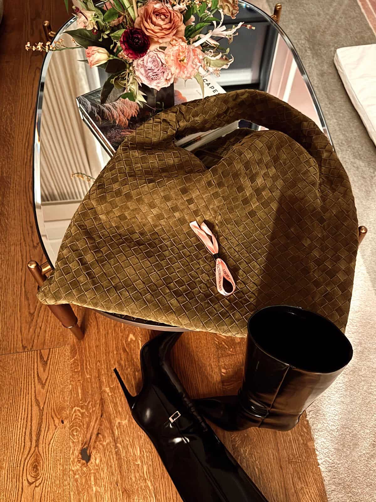 I am still so obsessed with the Bottega Veneta andiamo medium intrecciato suede tote.