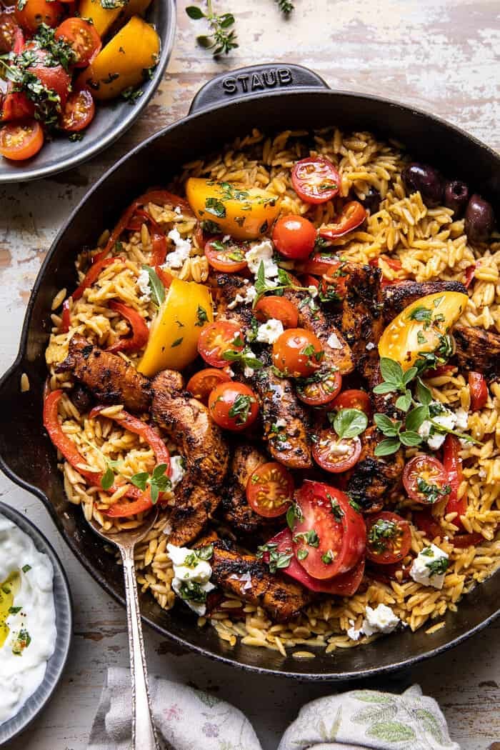 Keeping things colorful and easy today with this One Skillet Greek Chicken and Orzo with Tomatoes, Feta, and Tzatziki. Greek inspired oregano chicken cooked together with bell peppers and orzo pasta to create a deliciously, healthy one skillet style summer dinner. The chicken is finished with garlic tomatoes, feta cheese, and creamy tzatziki sauce. It’s simple but mouthwatering and made in no time.