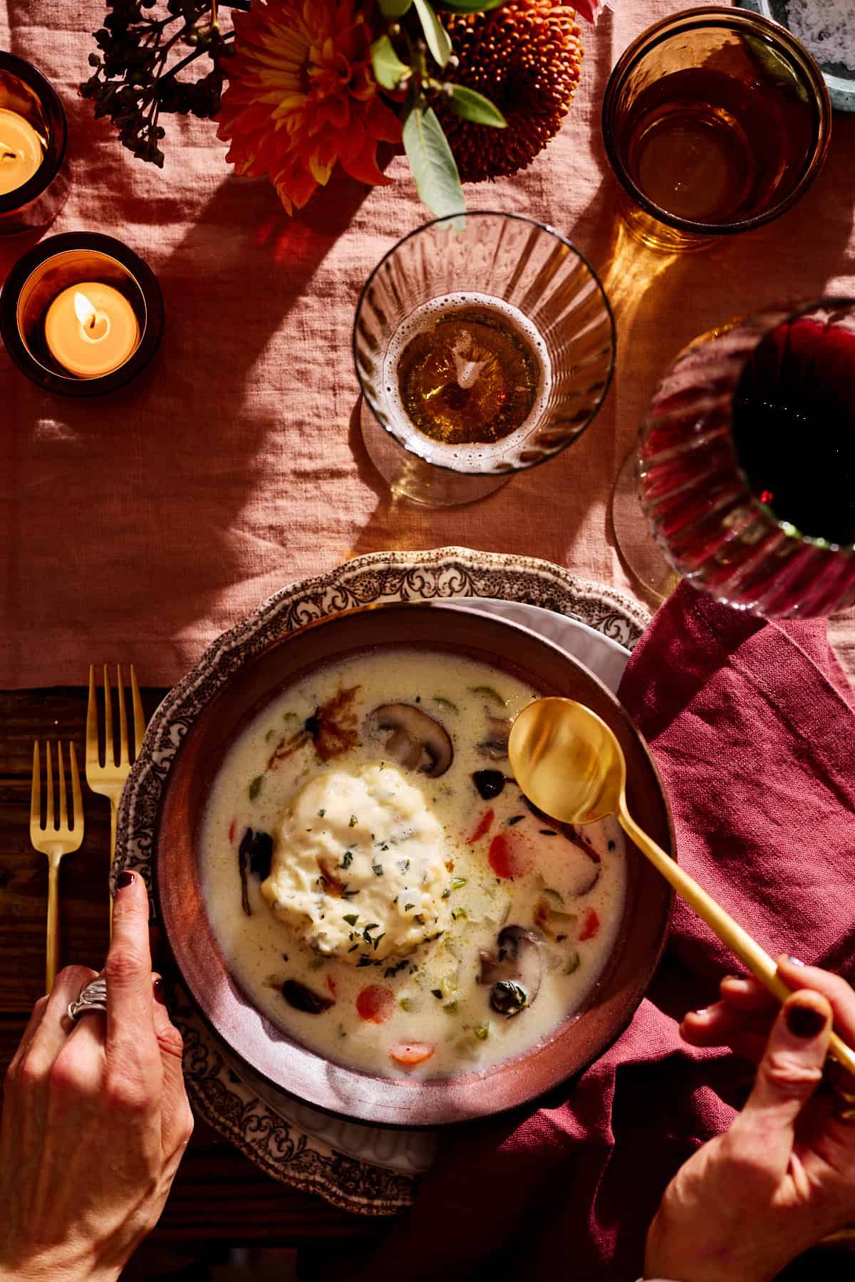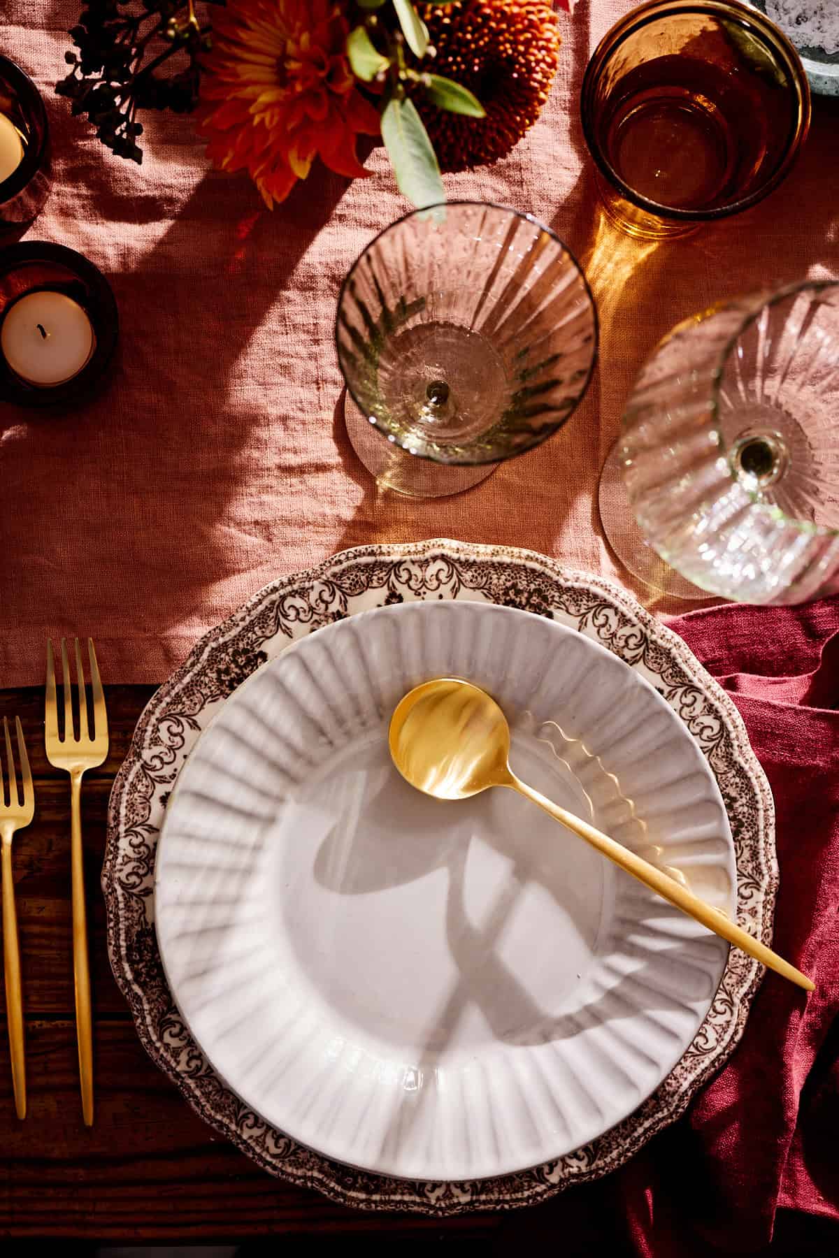The vibe is warm and welcoming โ think soft florals, tall taper candles, and low, glowing candlelight. Itโs a table that feels curated but still homey, seasonal but never staged.