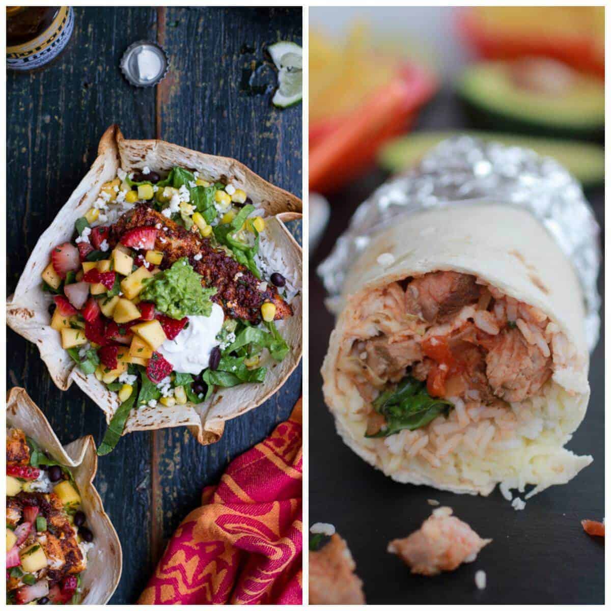 Chipotle Mahi Mahi Burrito Bowls w/ Coconut Lime Rice + Strawberry-Mango Salsa.