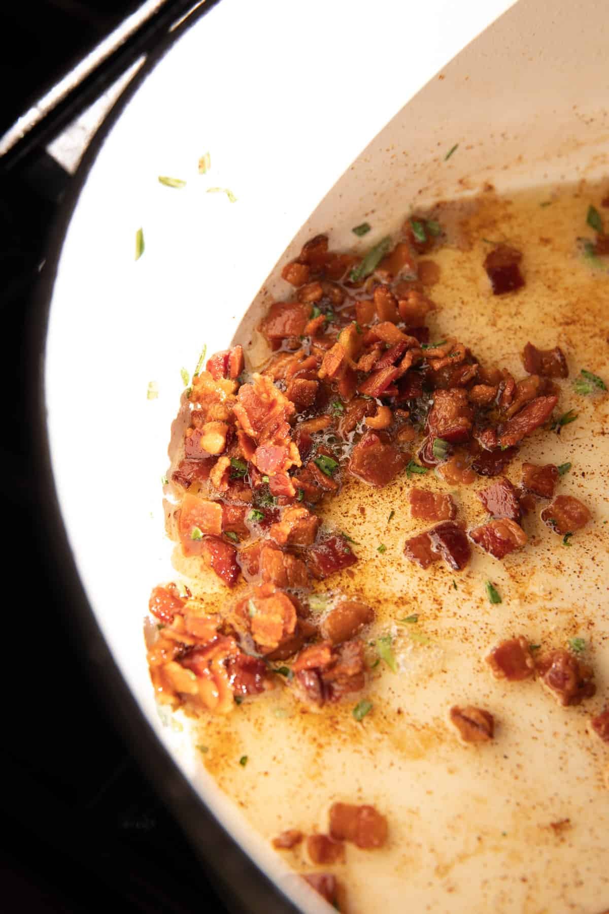 Before starting the base of the soup, cook off slices of bacon and dice them up. Get them really crispy, then add some rosemary. The rosemary will fry up in the oils and turn crisp.