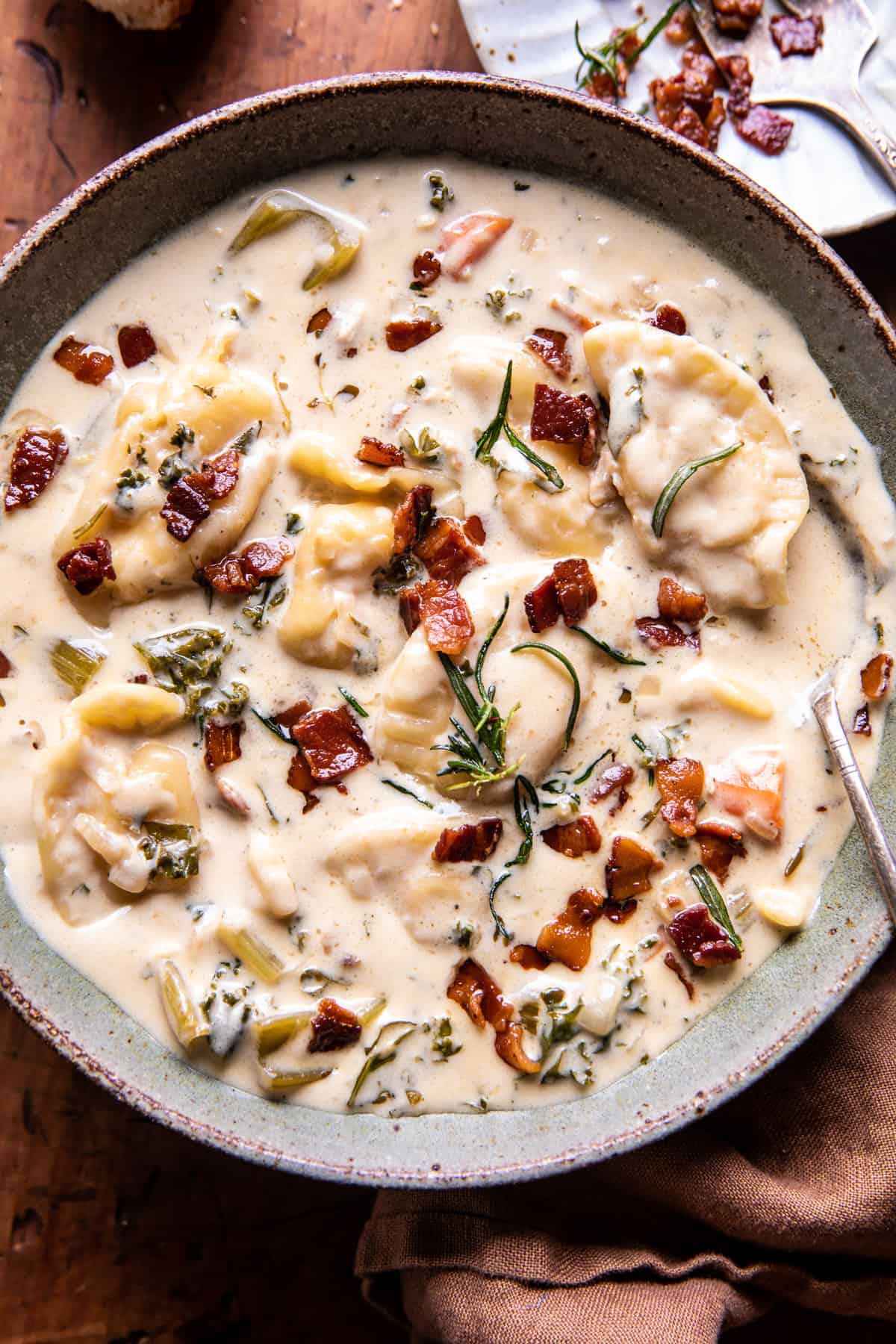 Creamy Pierogi Chicken Soup with Rosemary Bacon Bits