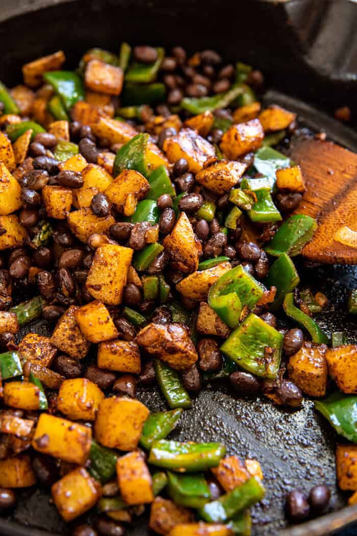 I love this recipe! Perfect no meat meal! I’ve added spinach and used cannellini beans when i didn’t have black beans on hand. The potatoes always seem to take a bit longer to cook than specified, but that’s not a big deal. It’s always worth the wait!