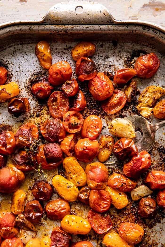 I always start out by roasting the tomatoes. It’s KEY to using cherry tomatoes, which I find to be pretty delicious year-round. I toss them up with olive oil, garlic, chili powder (for heat), and honey to help them really caramelize and become sweet and addicting.
