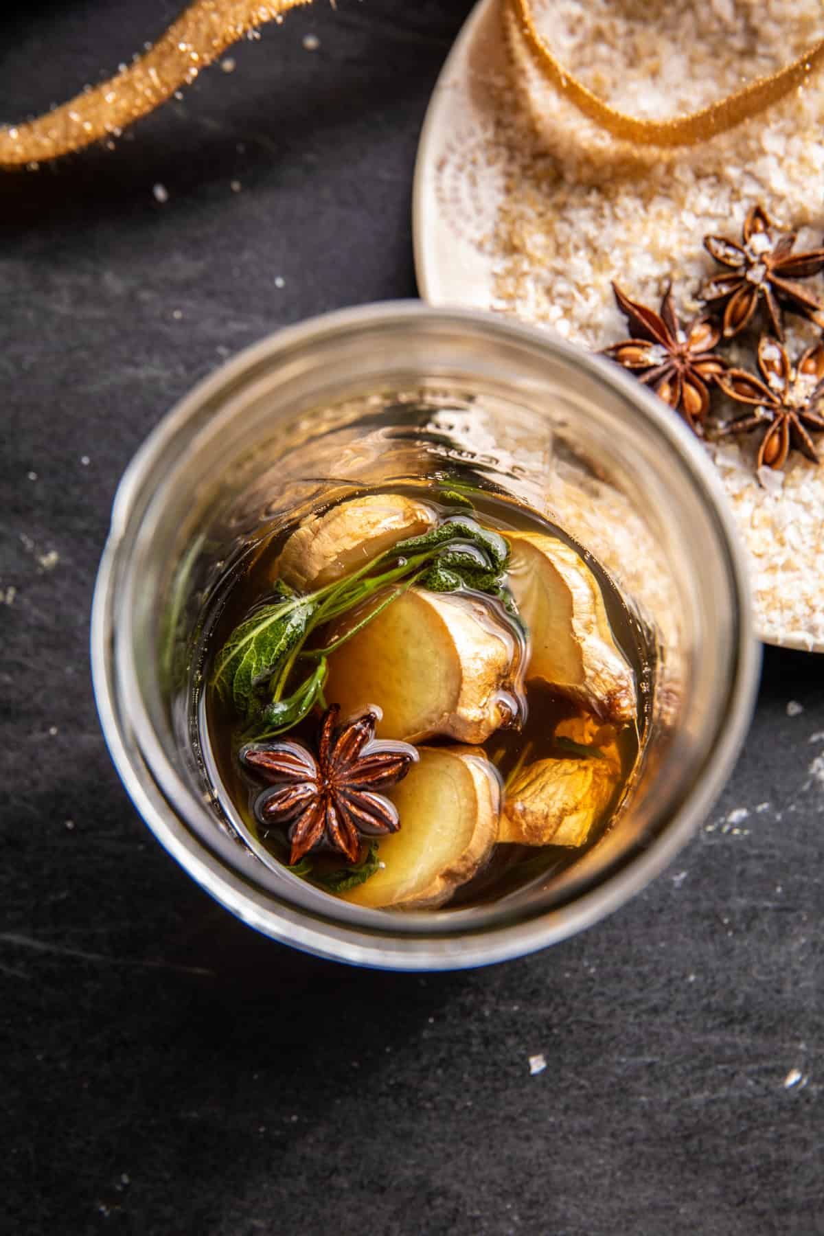 • 1. To make the sage ginger syrup, bring 1/2 cup water, honey, ginger, sage, and star anise to a boil over high heat. Once boiling simmer for 1-2 minutes, then remove from the heat. Let sit for 10 minutes. Store in a glass jar in the fridge for up to 2 weeks.