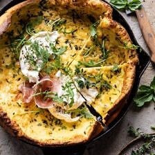This Savory Herb Butter Dutch Baby is eggy, perfectly buttery, and seasoned throughout with Parmesan cheese and fresh spring herbs. You can top it simply with a pat of butter, or really do it up with fresh burrata cheese, salty prosciutto, and additional herbs. Each and every bite is full of bright, herby flavor. Great for breakfast, brunch, or lunch. Or…do as I do…and serve this as a fun weeknight breakfast for dinner. Whatever way you go, you can’t go wrong!