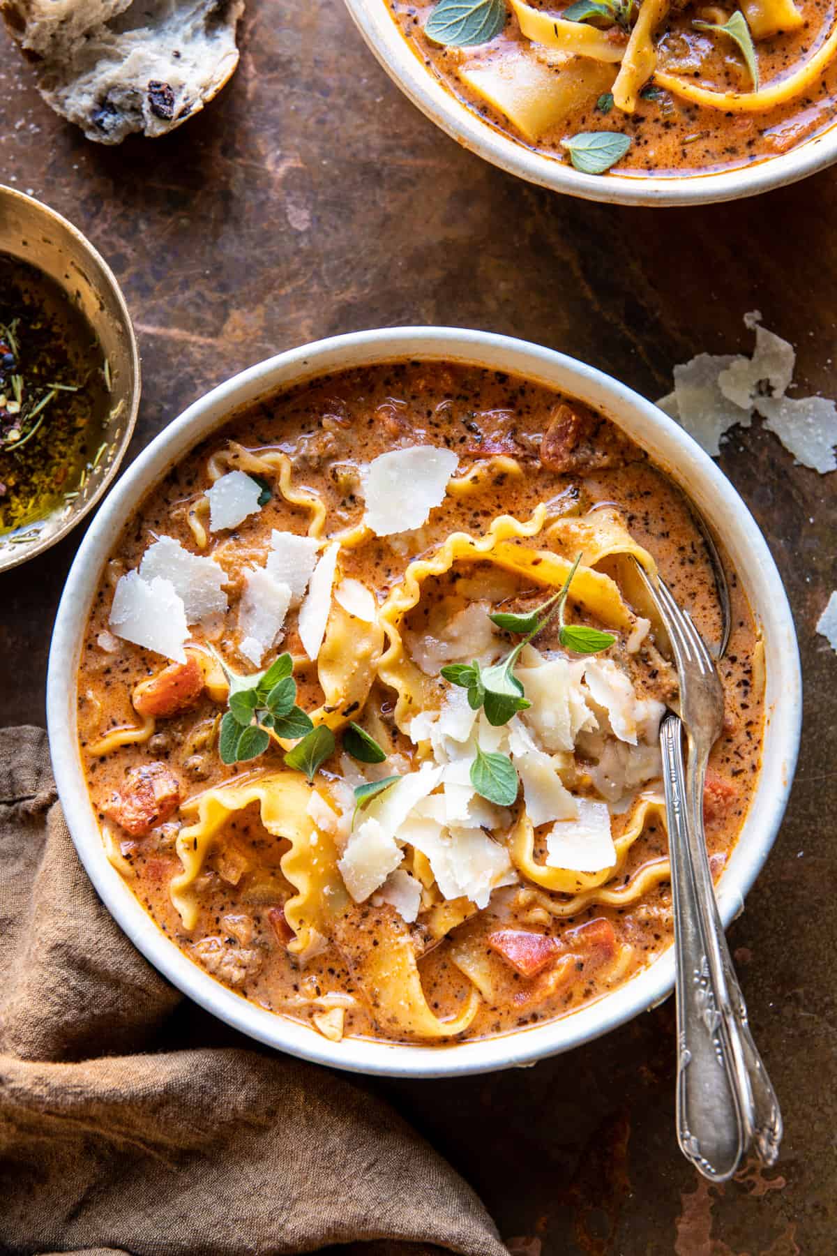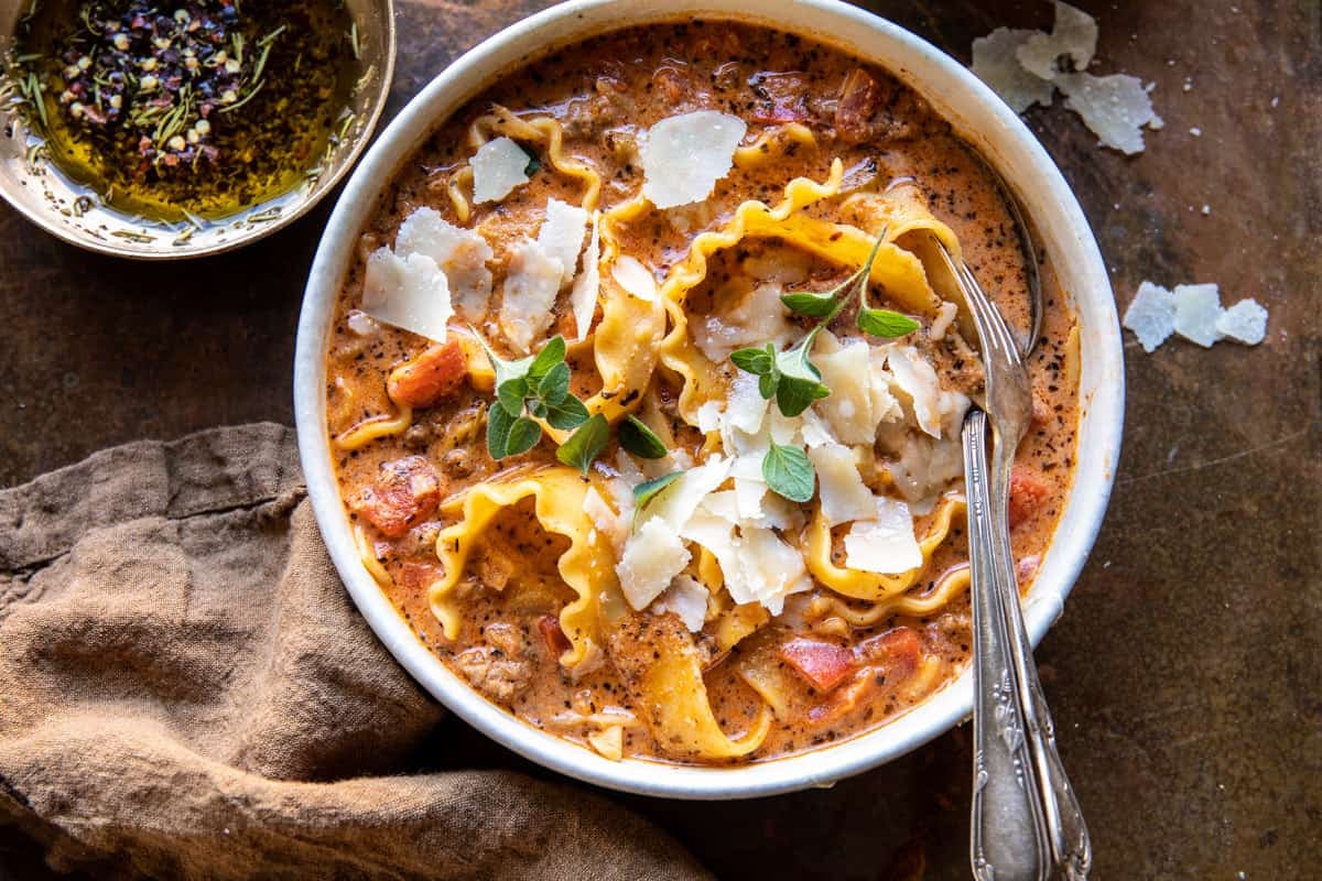 Creamy Spicy Lasagna Soup – great for when you’re wanting lasagna…but not all the work. A mix of vegetables simmered with meat, spicy sausage, Italian seasonings, tomatoes, and lasagna noodles. Finish each bowl off with parmesan and serve with your favorite garlic bread. It’s warming and so delicious, just like lasagna, but lighter and easier.