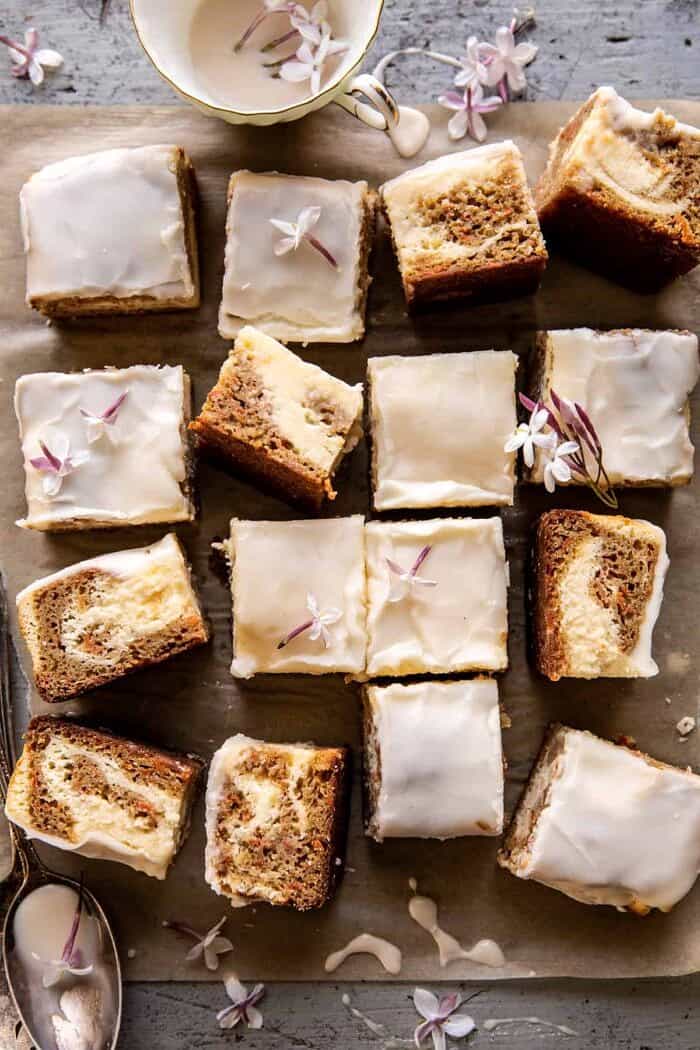 Swirled Carrot Cake Cheesecake Bars…the best of both worlds. Sweet carrot cake with notes of vanilla and cinnamon, swirled with rich, creamy cheesecake, and generously glazed with a retro-style vanilla glaze for an extra special touch. The added bonus is that these bars take almost no effort to make. The perfect treat for all your upcoming spring events…or simply to enjoy as an afternoon snack. Every last bite is truly delicious!